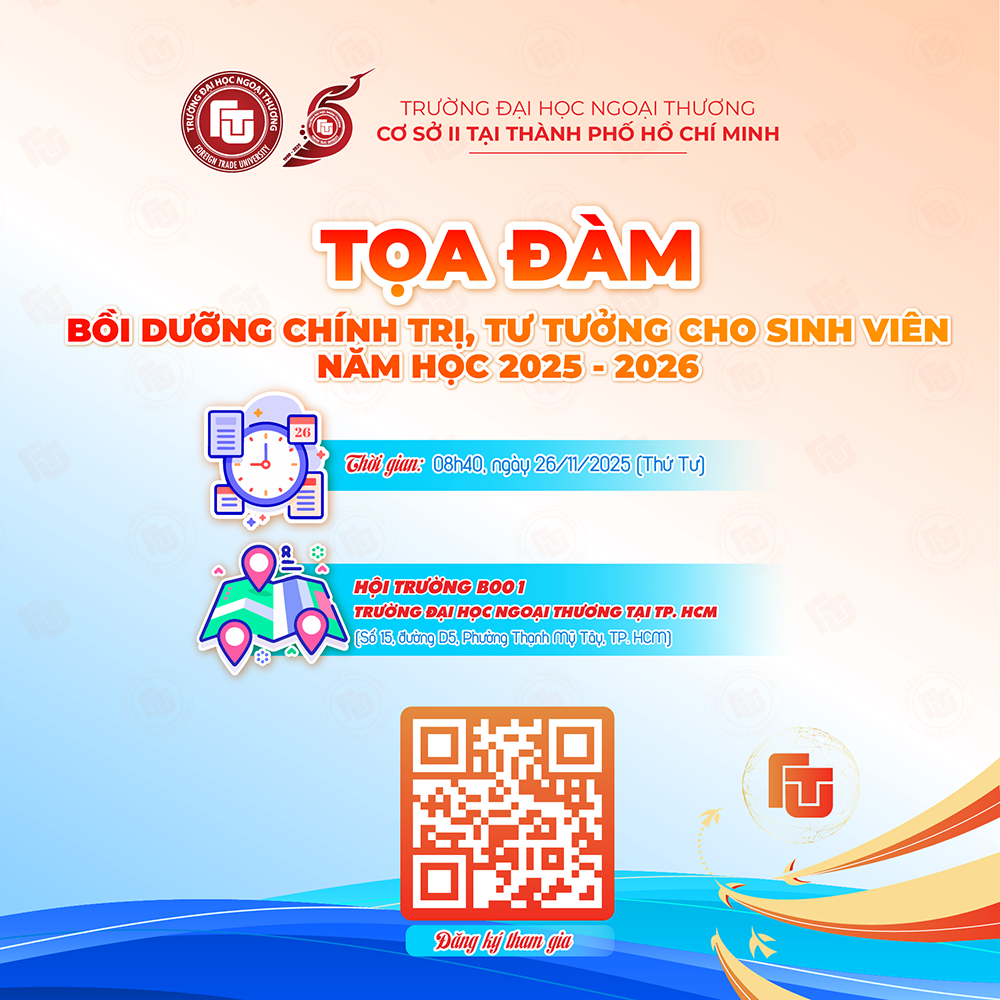 Nhằm nâng cao nhận thức chính trị, pháp luật và trách nhiệm công dân cho sinh viên, Cơ sở II Trường Đại học Ngoại thương tổ chức Tọa đàm Bồi dưỡng chính trị, tư tưởng dành cho sinh viên năm học 2025–2026.
