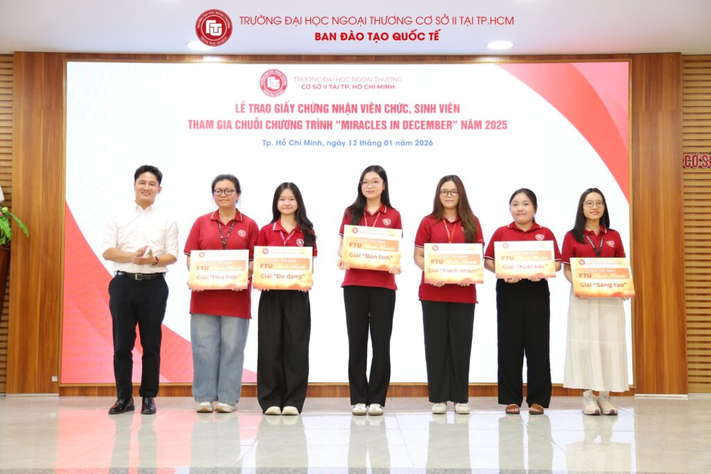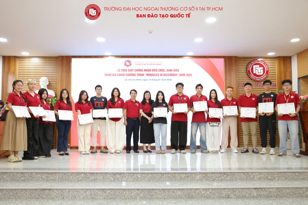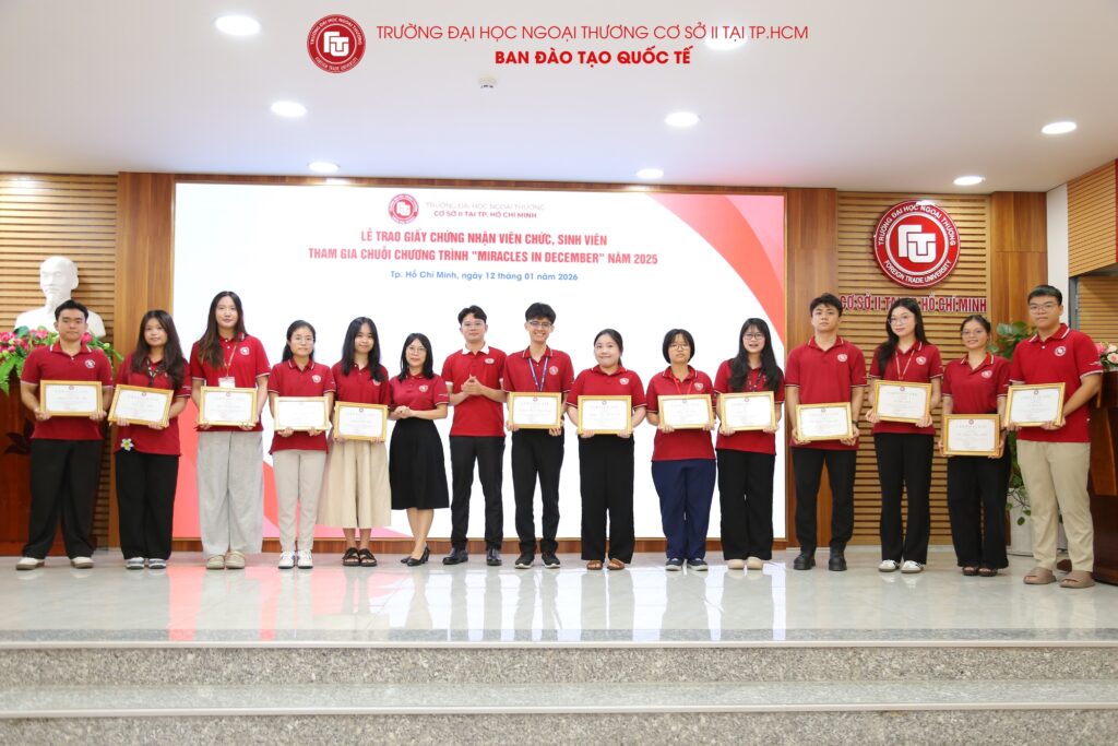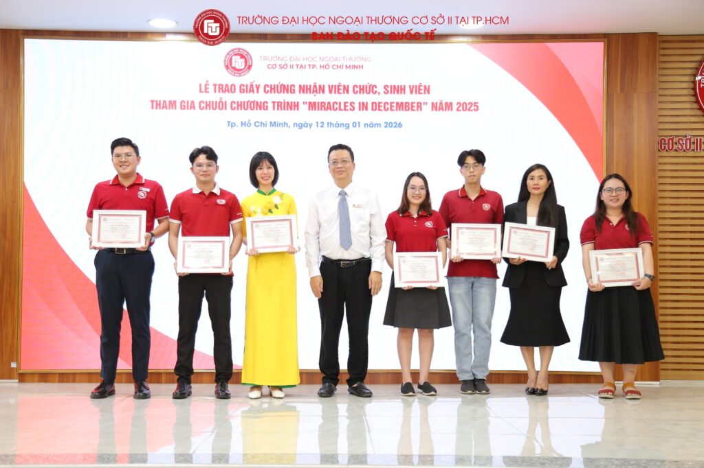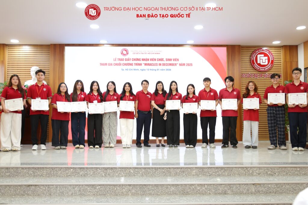 Nhằm ghi nhận và tri ân những đóng góp tích cực của viên chức và sinh viên trong chuỗi chương trình “Miracles in December” năm 2025, vừa qua, Trường Đại học Ngoại thương Cơ sở II tại TP. Hồ Chí Minh đã long trọng tổ chức Lễ trao Giấy chứng nhận sinh viên tham gia chuỗi chương trình “Miracles in December” 2025. Buổi lễ là dịp để Nhà trường cùng nhìn lại hành trình đầy ý nghĩa của chương trình, đồng thời biểu dương những tập thể, cá nhân đã đồng hành, cống hiến và góp phần tạo nên thành công chung của Miracles in December 2025.