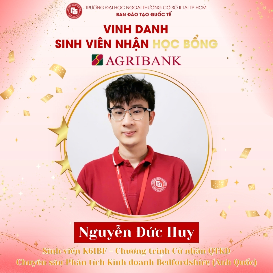 Theo kế hoạch phối hợp giữa Cơ sở II – Trường Đại học Ngoại thương và Ngân hàng Nông nghiệp và Phát triển Nông thôn Việt Nam (Agribank) – Chi nhánh Phú Nhuận, học bổng được trao cho các sinh viên Chương trình ĐTQT đáp ứng đầy đủ các tiêu chí về kết quả học tập, ý thức rèn luyện và tinh thần vượt khó trong học kỳ I năm học 2025 – 2026.