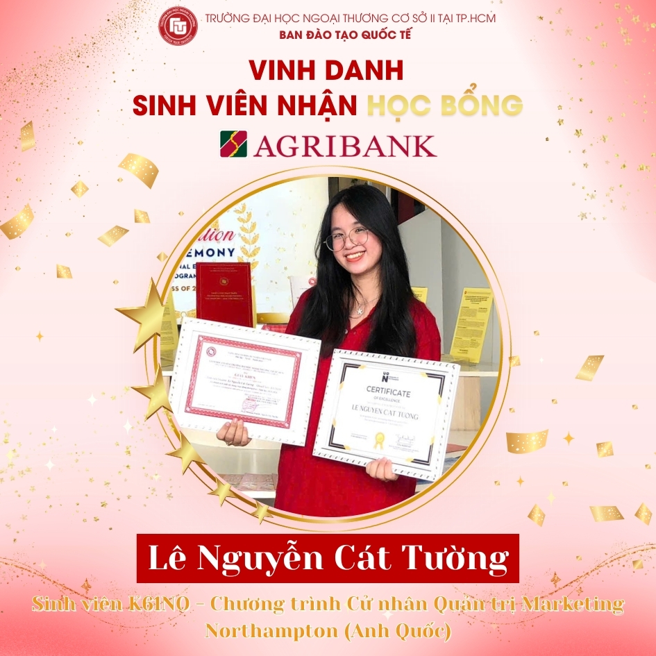 Mỗi suất học bổng Agribank không chỉ mang ý nghĩa hỗ trợ về mặt tài chính mà còn là sự ghi nhận xứng đáng đối với những nỗ lực bền bỉ của sinh viên trong suốt quá trình học tập và rèn luyện. Học bổng góp phần tiếp thêm niềm tin, tạo động lực để sinh viên Chương trình Đào tạo Quốc tế tiếp tục phấn đấu, phát huy năng lực cá nhân và chủ động nắm bắt các cơ hội học tập, nghiên cứu trong môi trường đào tạo mang tính hội nhập cao.