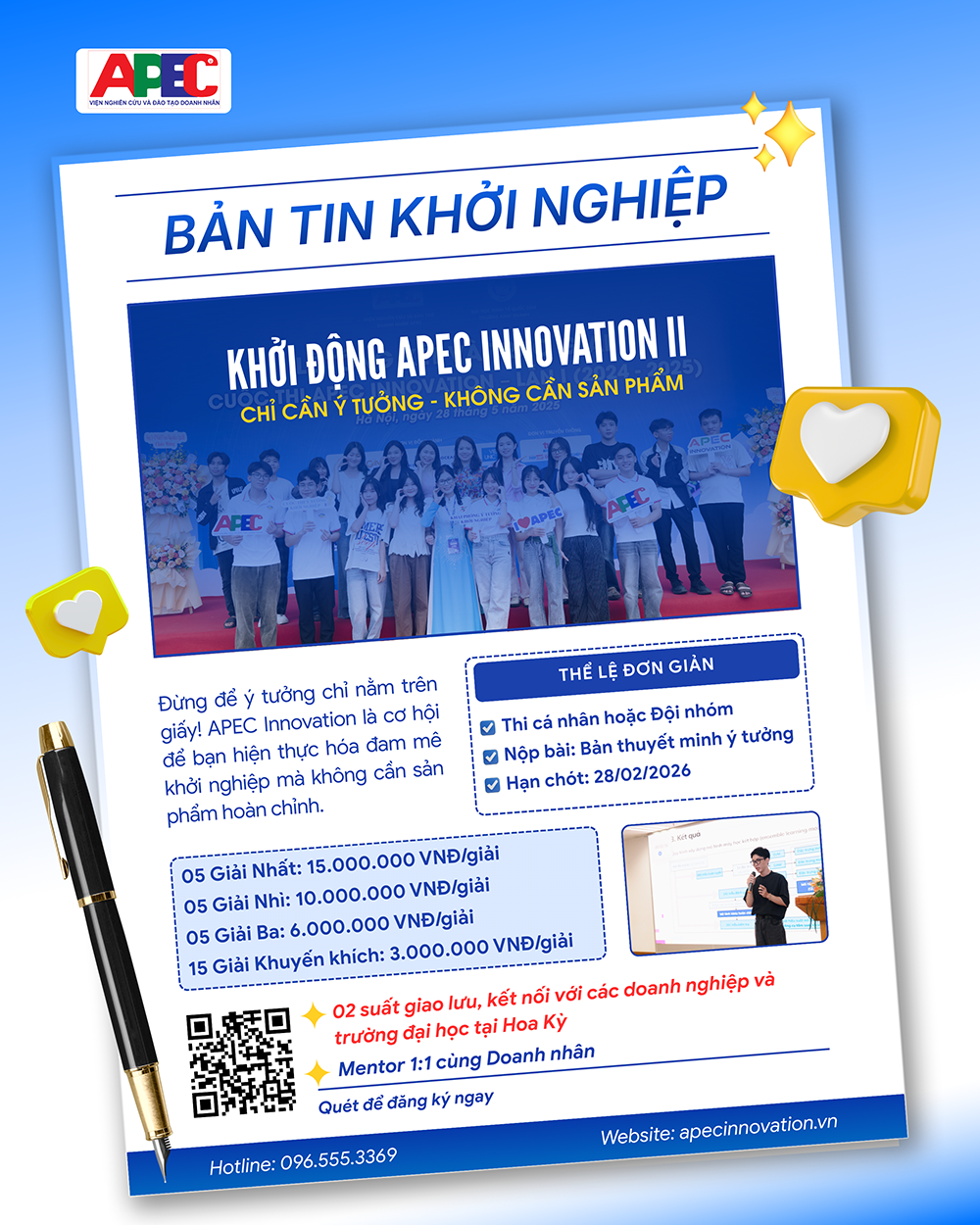 Thời gian nộp ý tưởng muộn nhất vào ngày 28/02/2026. Địa chỉ dự thi và tải mẫu thuyết minh tại: https://apecinnovation.vn/dang-ky/